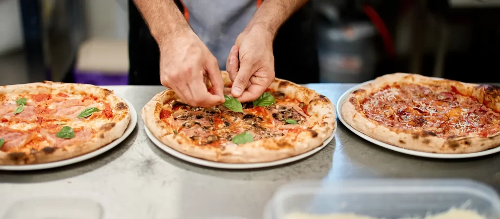 pomidory San Marzano DOP, mozzarella fior di latte, szynka Cotto, pieczarki glazurowane, oliwki Taggiasche, karczochy